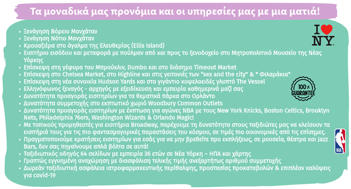 ** Ο ταξιδιωτικός οδηγός 64 σελίδων έχει συνταχθεί από εμάς ειδικά για τους ταξιδιώτες μας, με βάση τις εμπειρίες 36 ετών ταξιδίων στις ΗΠΑ και περιλαμβάνει χρήσιμες πληροφορίες και μυστικά τα οποία θα βοηθήσουν να αξιοποιηθεί στο έπακρο ο ελεύθερος χρόνος.
