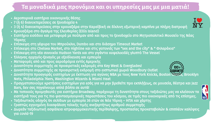 ** Ο ταξιδιωτικός οδηγός 64 σελίδων έχει συνταχθεί από εμάς ειδικά για τους ταξιδιώτες μας, με βάση τις εμπειρίες 36 ετών ταξιδίων στις ΗΠΑ και περιλαμβάνει χρήσιμες πληροφορίες και μυστικά τα οποία θα βοηθήσουν να αξιοποιηθεί στο έπακρο ο ελεύθερος χρόνος.