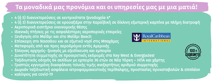 Σημείωση: Σε κάποιες αναχωρήσεις ενδέχεται μία διανυκτέρευση στην κρουαζιέρα να αντικατασταθεί από μία διανυκτέρευση στο Μαϊάμι.