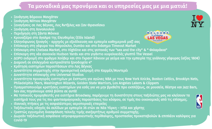 ** Ο ταξιδιωτικός οδηγός 64 σελίδων έχει συνταχθεί από εμάς ειδικά για τους ταξιδιώτες μας, με βάση τις εμπειρίες 36 ετών ταξιδιών στις ΗΠΑ και περιλαμβάνει χρήσιμες πληροφορίες και μυστικά τα οποία θα βοηθήσουν να αξιοποιηθεί στο έπακρο ο ελεύθερος χρόνος.