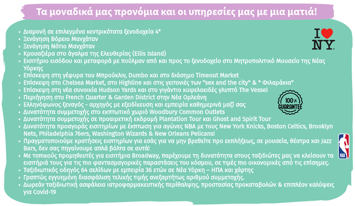 ** Ο ταξιδιωτικός οδηγός 64 σελίδων έχει συνταχθεί από εμάς ειδικά για τους ταξιδιώτες μας, με βάση τις εμπειρίες 36 ετών ταξιδίων στις ΗΠΑ και περιλαμβάνει χρήσιμες πληροφορίες και μυστικά τα οποία θα βοηθήσουν να αξιοποιηθεί στο έπακρο ο ελεύθερος χρόνος.