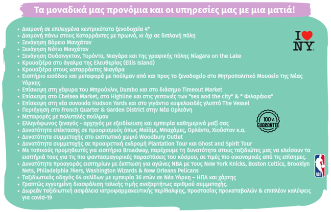 ** Ο ταξιδιωτικός οδηγός 64 σελίδων έχει συνταχθεί από εμάς ειδικά για τους ταξιδιώτες μας, με βάση τις εμπειρίες 36 ετών ταξιδιών στις ΗΠΑ και περιλαμβάνει χρήσιμες πληροφορίες και μυστικά τα οποία θα βοηθήσουν να αξιοποιηθεί στο έπακρο ο ελεύθερος χρόνος.