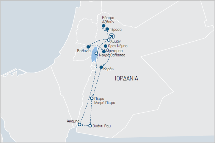 Αμμάν, Γέρασα, Κάστρο Αζλούν, Βηθανία, Μάνταμπα, Όρος Νέμπο, Κάστρο Κεράκ, Πέτρα, "Μικρή Πέτρα", Ουάντι Ραμ, Άκαμπα, Νεκρά Θάλασσα