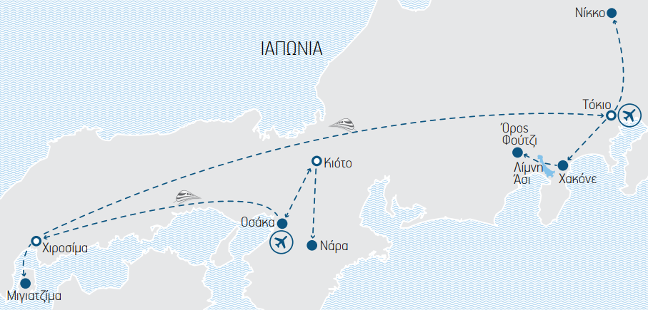 Σημείωση: Οι αποσκευές του γκρουπ μεταφέρονται οδικώς από το ξενοδοχείο του Τόκιο στο ξενοδοχείο του Κιότο. Για τον λόγο αυτόν στις διαδρομές με το τραίνο, αλλά και για την διανυκτέρευση στην Χιροσίμα, φροντίστε να έχετε μαζί σας μόνο μια χειραποσκευή με τα απαραίτητα