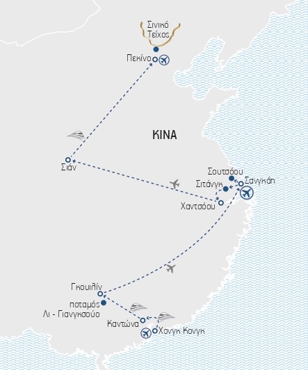Σας καλωσορίζει και εξερευνά μαζί σας τη μακρινή Κίνα, εκεί που η πιο απεμπειρία μετατρέπεται σε μια συναρπαστική περιπέτεια. Μια ζωντανή χώρα όπου ένας πολιτισμό5.000 χρόνων συναντά τον σύγχρονο κόσμο και συνυπάρχει μαζί του. Ζήστε το Χονγκ Κόνγκ τη "Νέα Υόρκη της Ανατολής", την πόλη με τις πολλές αντιθέσεις. Περιηγηθείτε στην Καντώνα την περίφημη Γκουανγκζού) και μείνετε εκστατικοί μπροστά μεγαλύτερο και εντυπωσιακότερο σπήλαιο του Γκουιλίν, γνωστό ως "Σπήλαιο του Καλαμένιου Αυλού” Αφεθείτε στον ρυθμό του Πεκίνου που δημιουργούν τα 22 εκατομμύρια κάτοικοί του, περπατήστε στην πλατεία Τιενανμέν, και θαυμάστε την επιβλητική Απαγορευμένη Πόλη. Διασχίστε με υπερταχεία την απέραντη χώρα και κάντε ένα ταξίδι στο χρόνο, στη Σιαν, την πρώην πρωτεύουσα της χώρας, με τους πήλινους στρατιώτες φύλακές της. Οι πολιτιστικοί θησαυροί της Κίνας και ο ιδιαίτερος τρόπος ζωής και φιλοσοφίας των κατοίκων της, μας περιμένουν σε κάθε γωνιά, είτε σε κάποιον υδάτινο παραμυθένιο κήπο, είτε σε μια από τις πολυάριθμες μοντέρνες πόλεις, όπως, η Χαντσόου, Ξιτάνγκ και φυσικά η θρυλική και γεμάτη κίνηση και ζωντάνια Σαγκάη. Μια χώρα κι ένα ταξίδι που αποτελούν διαρκή έμπνευση για κάθε ταξιδιώτη.