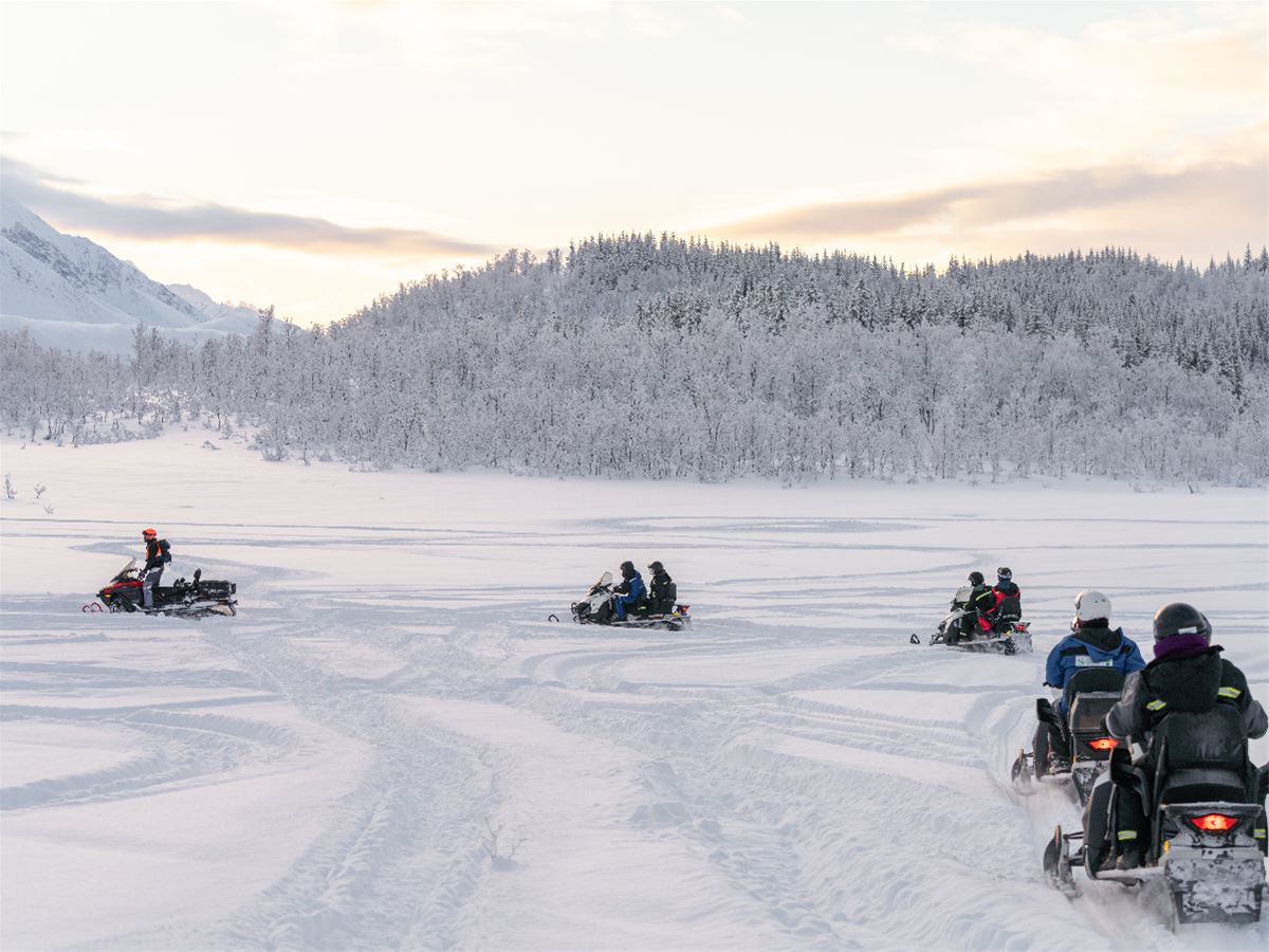 Ξεκινάμε τη μέρα μας με ένα μικρό περίπατο και αφού φορέσουμε τον ειδικό ρουχισμό που θα μας κρατήσει ζεστούς στις ασυνήθιστες θερμοκρασίες, θα συμμετάσχουμε σε ένα σαφάρι με snowmobiles που ξεκινάει από το φιόρδ και μέσα από μονοπάτια του πυκνού δάσους, φτάνουμε σε παγωμένες λίμνες και ποτάμια. Στη διαδρομή έχουν προβλεφθεί στάσεις αλλαγής οδηγών, για ξεκούραση και φωτογραφίες. Επιστροφή στην πόλη και μετάβαση με το τελεφερίκ στο λόφο Fjellheisen για να δούμε το φωτισμένο Τρόμσο από το υψόμετρο των 1260μ. Από αυτό το σημείο η παρακολούθηση του Βόρειου Σέλαος είναι μαγεία.