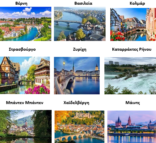 Μάιντς – Χαϊδελβέργη – Μπάντεν Μπάντεν – Στρασβούργο – Κολμάρ – Χωριά Αλσατίας – Βασιλεία – Βέρνη – Ζυρίχη-Καταρράκτες Ρήνου