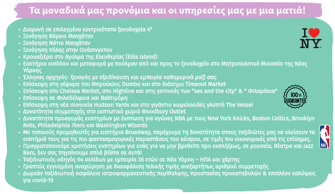 ** Ο ταξιδιωτικός οδηγός 64 σελίδων έχει συνταχθεί από εμάς ειδικά για τους ταξιδιώτες μας, με βάση τις εμπειρίες 36 ετών ταξιδιών στις ΗΠΑ και περιλαμβάνει χρήσιμες πληροφορίες και μυστικά τα οποία θα βοηθήσουν να αξιοποιηθεί στο έπακρο ο ελεύθερος χρόνος.