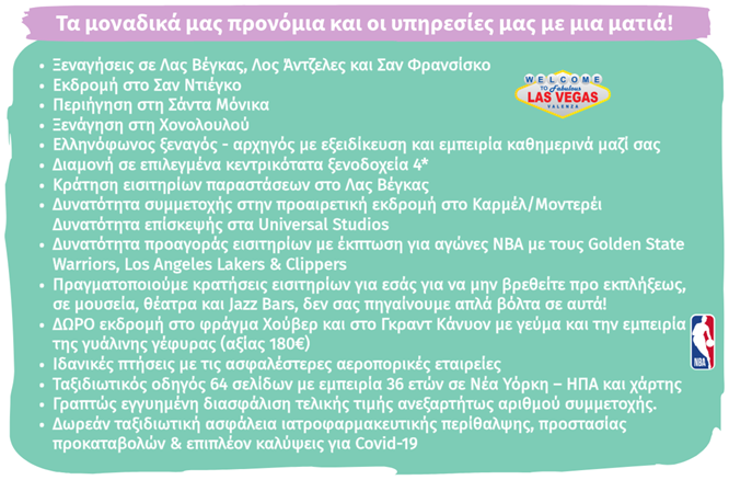 Λας Βέγκας/Grand Canyon – Λος Άντζελες /San Diego/ Disneyland/Universal Studios – Παραλίες Καλιφόρνια / Σάντα Μόνικα – Beverly Hills – Μοντερέι, Καρμέλ - Σαν Φρανσίσκο - Χονολούλου