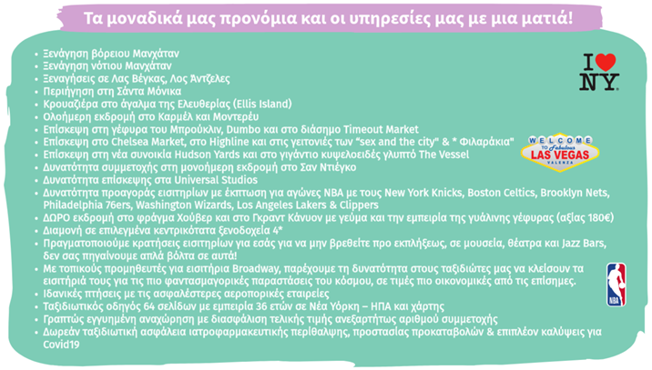 ** Ο ταξιδιωτικός οδηγός 64 σελίδων έχει συνταχθεί από εμάς ειδικά για τους ταξιδιώτες μας, με βάση τις εμπειρίες 36 ετών ταξιδιών στις ΗΠΑ και περιλαμβάνει χρήσιμες πληροφορίες και μυστικά τα οποία θα βοηθήσουν να αξιοποιηθεί στο έπακρο ο ελεύθερος χρόνος.