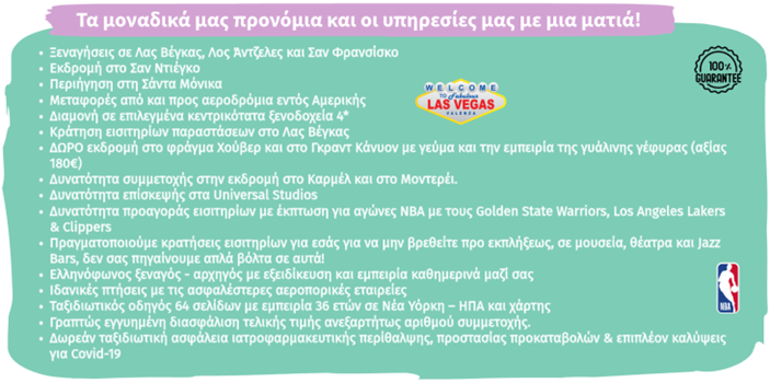 Οι τιμές των εκδρομών είναι ΤΕΛΙΚΕΣ με φόρους | Δεν περιλαμβάνονται μόνο τα φιλοδωρήματα / Resort Fees Λας Βέγκας Είναι υπολογισμένες με έκπτωση €200 ανά άτομο για έγκαιρη κράτηση |
