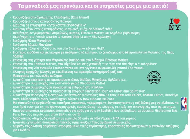 ** Ο ταξιδιωτικός οδηγός 64 σελίδων έχει συνταχθεί από εμάς ειδικά για τους ταξιδιώτες μας, με βάση τις εμπειρίες 36 ετών ταξιδιών στις ΗΠΑ και περιλαμβάνει χρήσιμες πληροφορίες και μυστικά τα οποία θα βοηθήσουν να αξιοποιηθεί στο έπακρο ο ελεύθερος χρόνος.