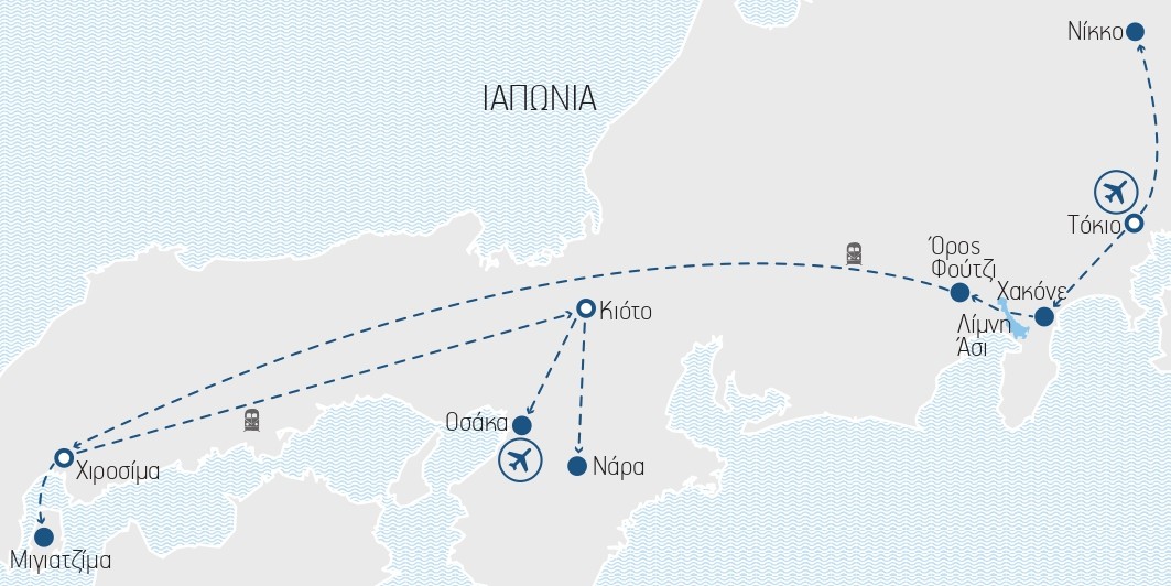 Οσάκα, Κιότο, Δάσος Μπαμπού, Νάρα, Χιροσίμα, Μιγιατζίμα, Χακόνε, Λίμνη Άσι, Όρος Φούτζι, Τόκιο, Νίκκο, Καμακούρα, Γιοκοχάμα