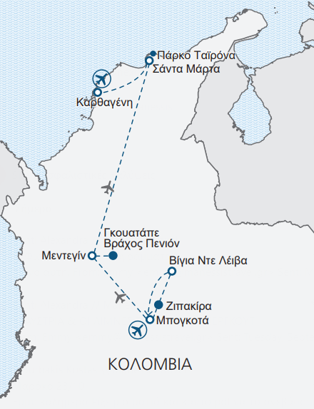 Ξεκινώντας από την κοσμοπολίτικη πρωτεύουσα Μπογκοτά με το εκπληκτικό Μουσείο Χρυσού και την κοντινή της Ζιπακίρα με τον εντυπωσιακό υπόγειο Καθεδρικό ναό φτιαγμένο από αλάτι, φθάνουμε στην γραφική αποικιακή κωμόπολη Βίγια Ντε Λέιβα, επισκεπτόμαστε το αναγεννημένο Μεντεγίν, το πανέμορφο χωριό Γκουατάπε με τον γρανιτένιο βράχο Πενιόν, τον πρώτο Ισπανικό οικισμό στην Κολομβία, την υπέροχη Σάντα Μάρτα, το εκπληκτικής ομορφιάς παράκτιο Εθνικό Πάρκο Ταϊρόνα με τις ονειρικές αμμουδιές, τα γαλαζοπράσινα νερά, τους κοραλλιογενείς υφάλους και την πλούσια βλάστηση και καταλήγουμε στην εξωτική Καρθαγένη, με την γοητεία της αποικιακής της αρχιτεκτονικής, τη ζωντάνια της νυχτερινής της ζωής, την εξαιρετική της κουζίνα και τις θαυμάσιες παραλίες στα ζεστά νερά της Καραϊβικής.
