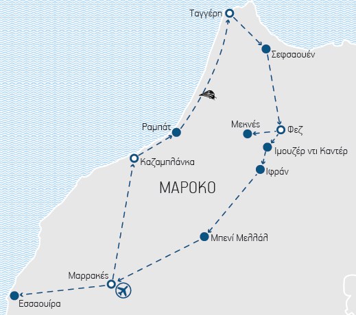 Καζαμπλάνκα, Ραμπάτ, Ταγγέρη, Σεφσαουέν, Φεζ, Μεκνές, Ιφράν, Ιμουζέρ ντι Καντέρ, Μαρρακές, Εσσαουίρα